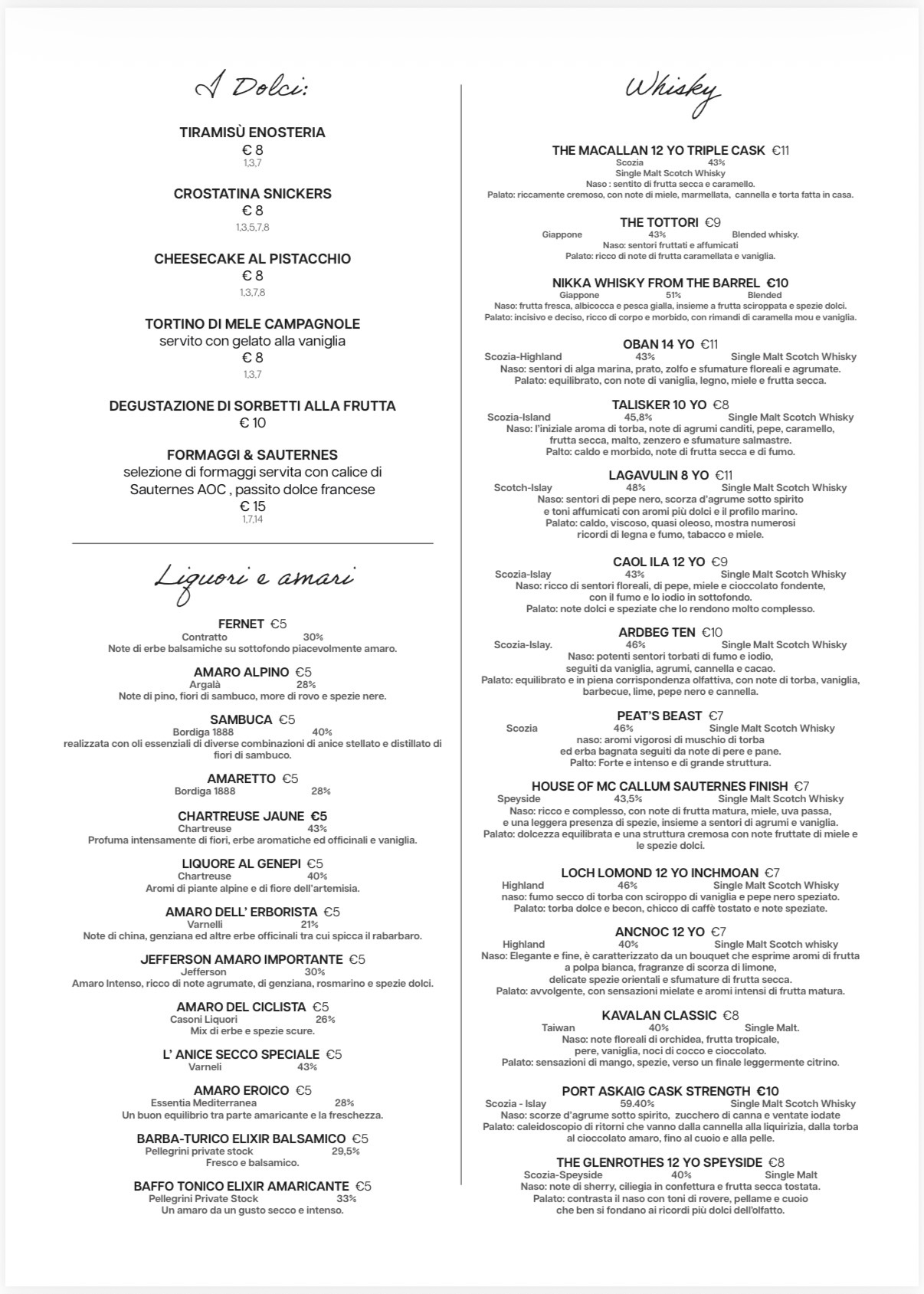 DOLCI, LIQUORI, AMARI, DISTILLATI, WHISKY